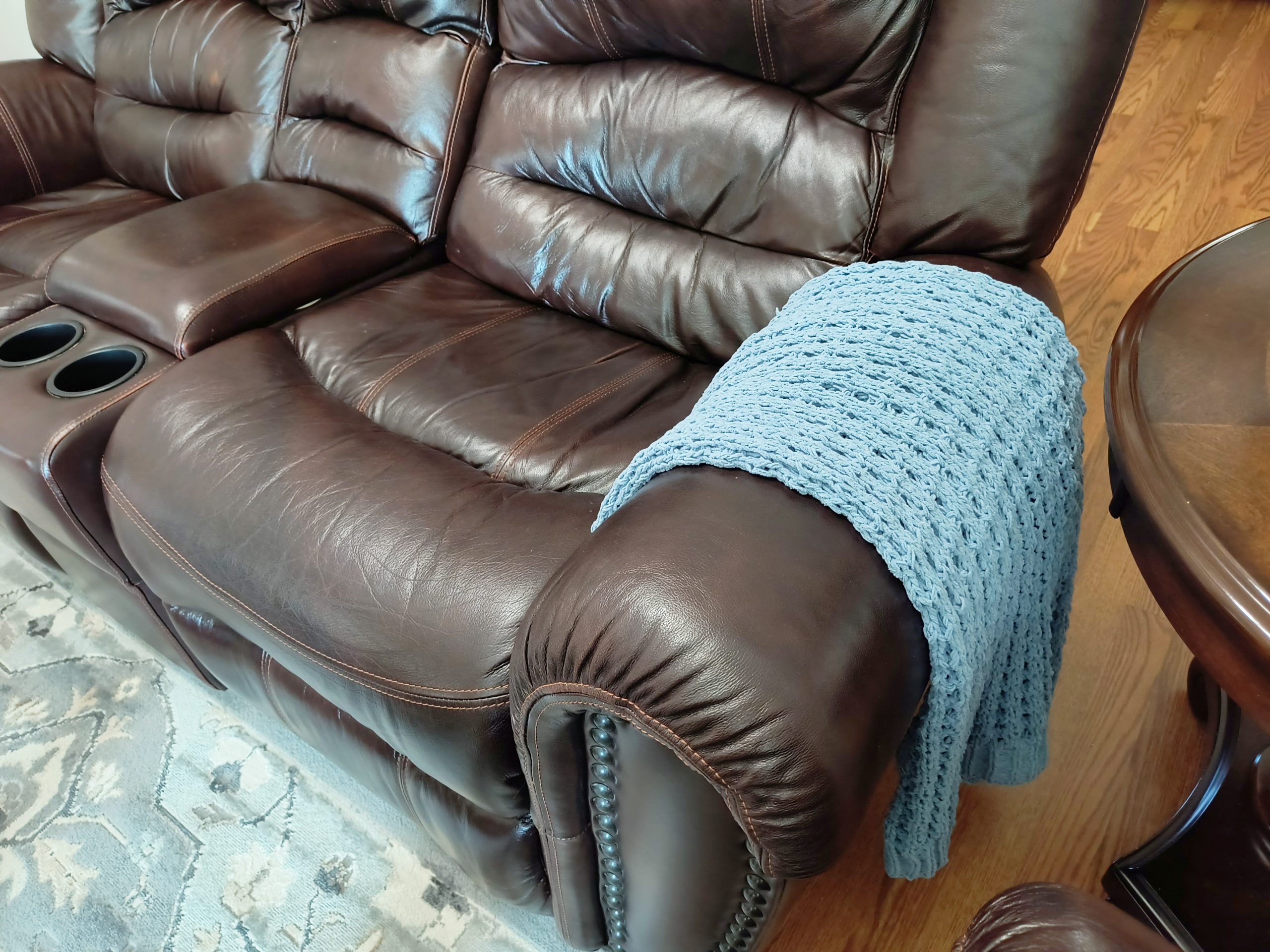 To soften up the leather I draped a throw with tassels over the arm of the recliner.