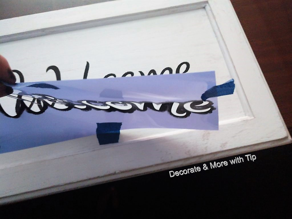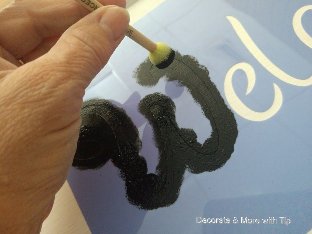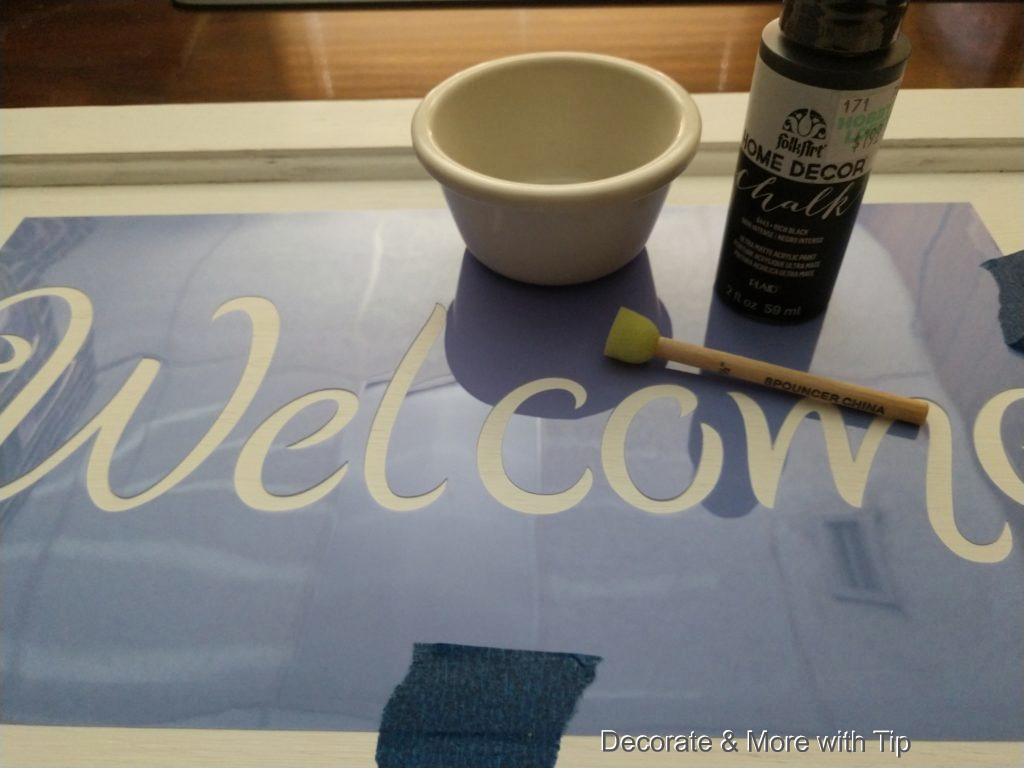 On my tray I want to add the word Welcome to the center. Purchased a stencil from Hobby Lobby, grabbed my black chalk paint with a stencil sponge brush.