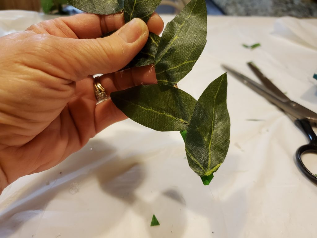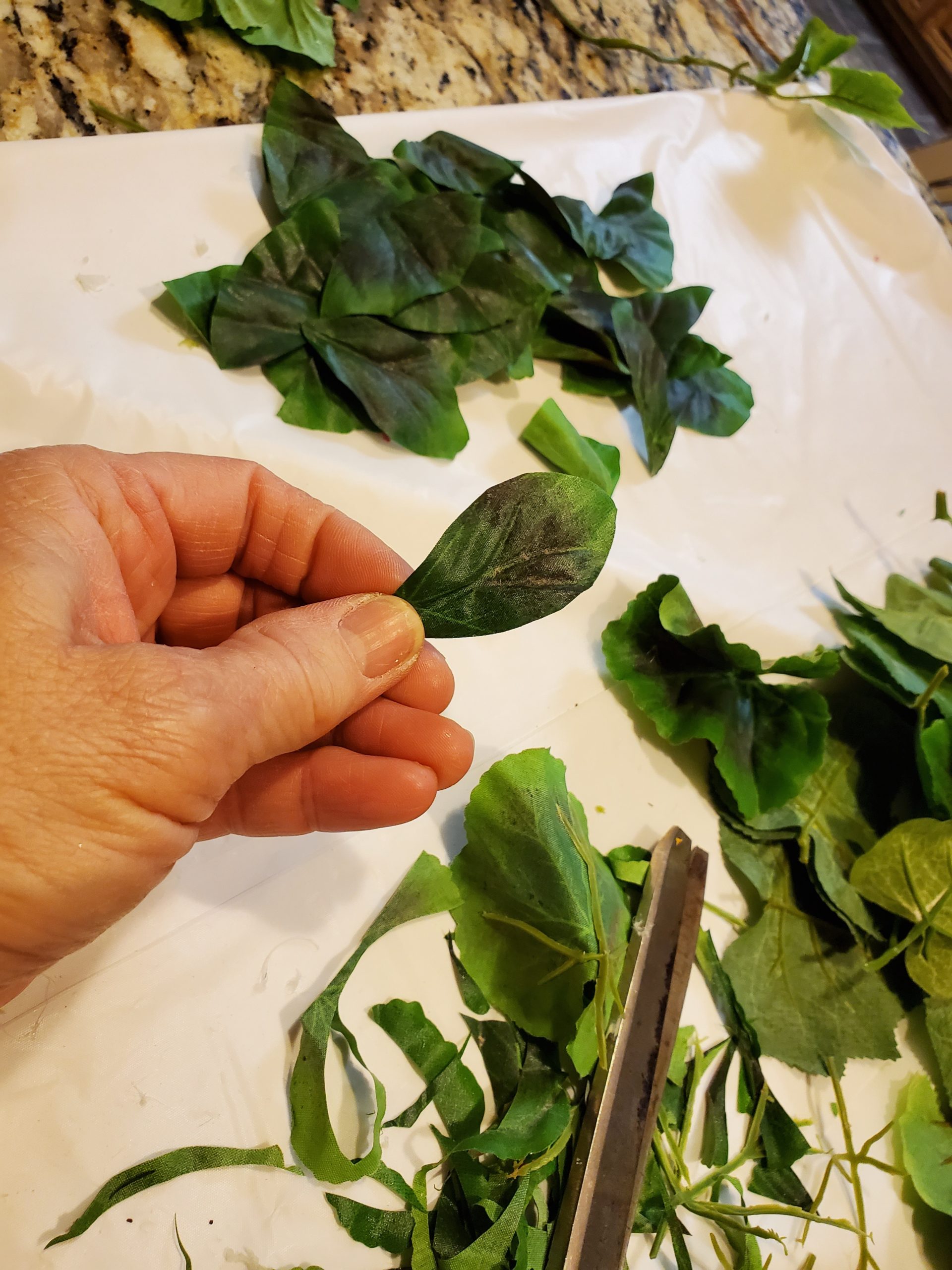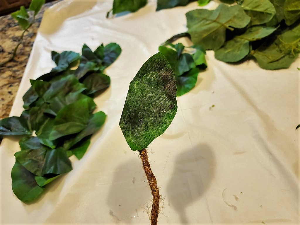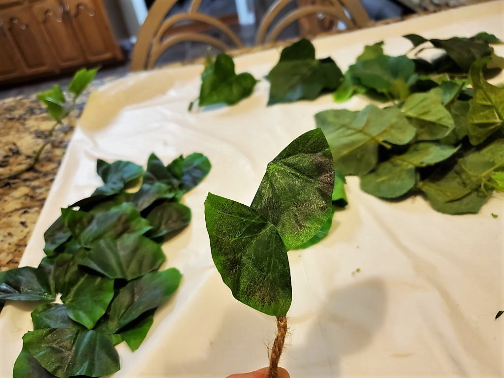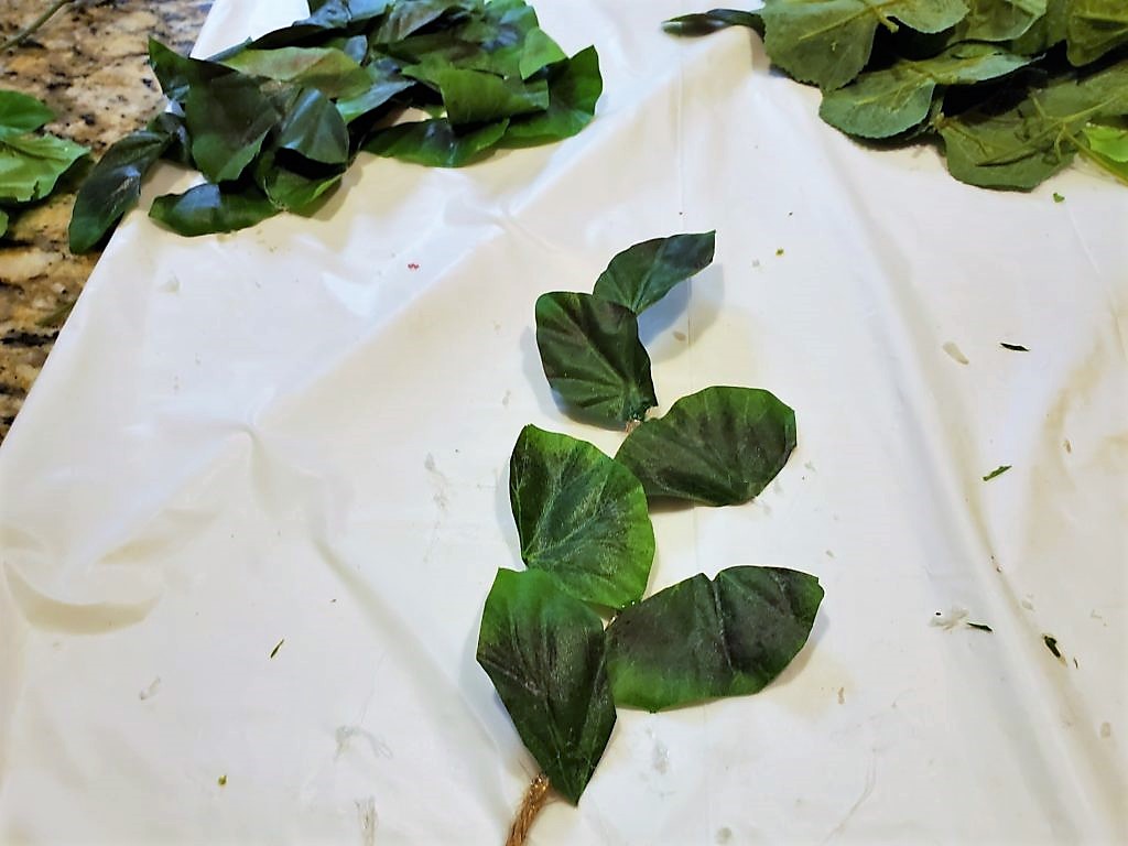 I thought about purchasing the garlands at Hobby Lobby since they are running 50% off all their garlands this week. Their lowest garland price was $10.00 a garland. I just couldn’t see paying that much for garland, remember I am needing 5 for the shower. I came home and put my thinking cap on. I came up with the idea of making a leaf garland from two old leaf bundles I had tucked away for our next yard sale. I grabbed 2 of the same bundles of leaves to use for my garland and I purchased 5 jute wire cord from Dollar Tree.