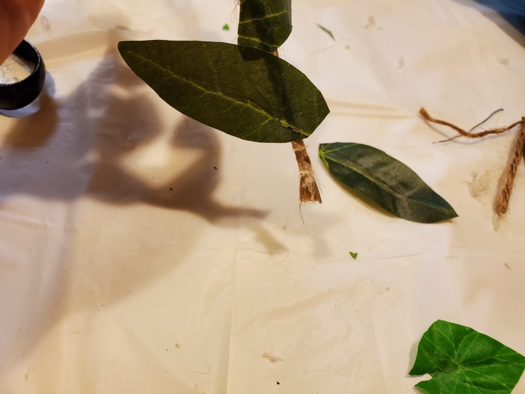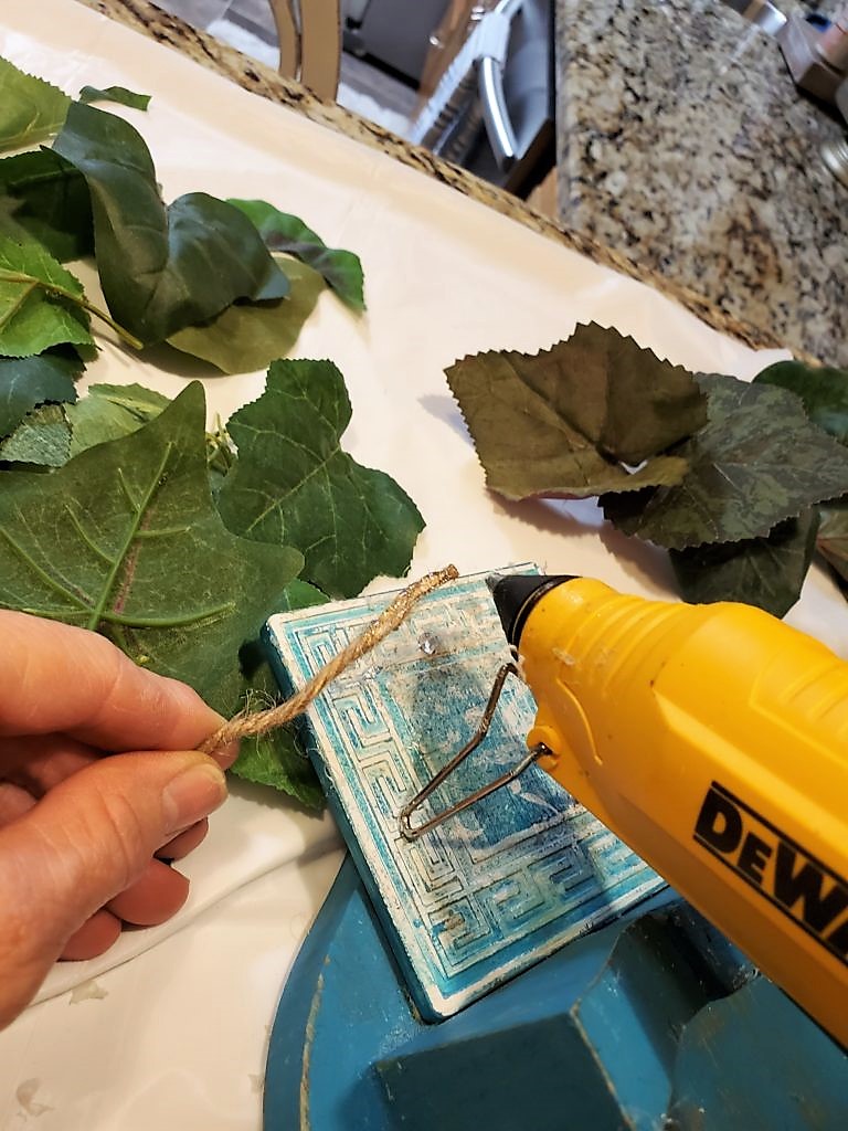 Starting with one end of the cord working your leaves downward. Add hot glue to the end and place a leaf to the top of the cord.