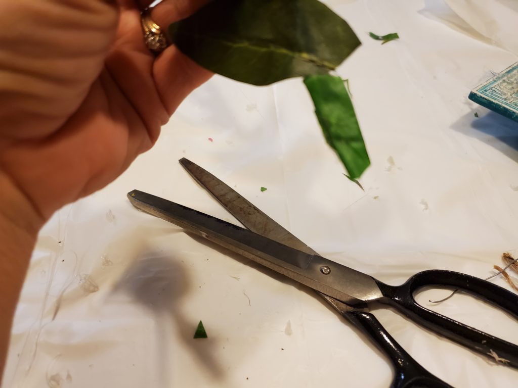 The hardest and longest process of this DIY is cutting the leaves. I want a very simple garland not thick and bulky. I am cutting my leaves to resemble a lemon tree leaf.