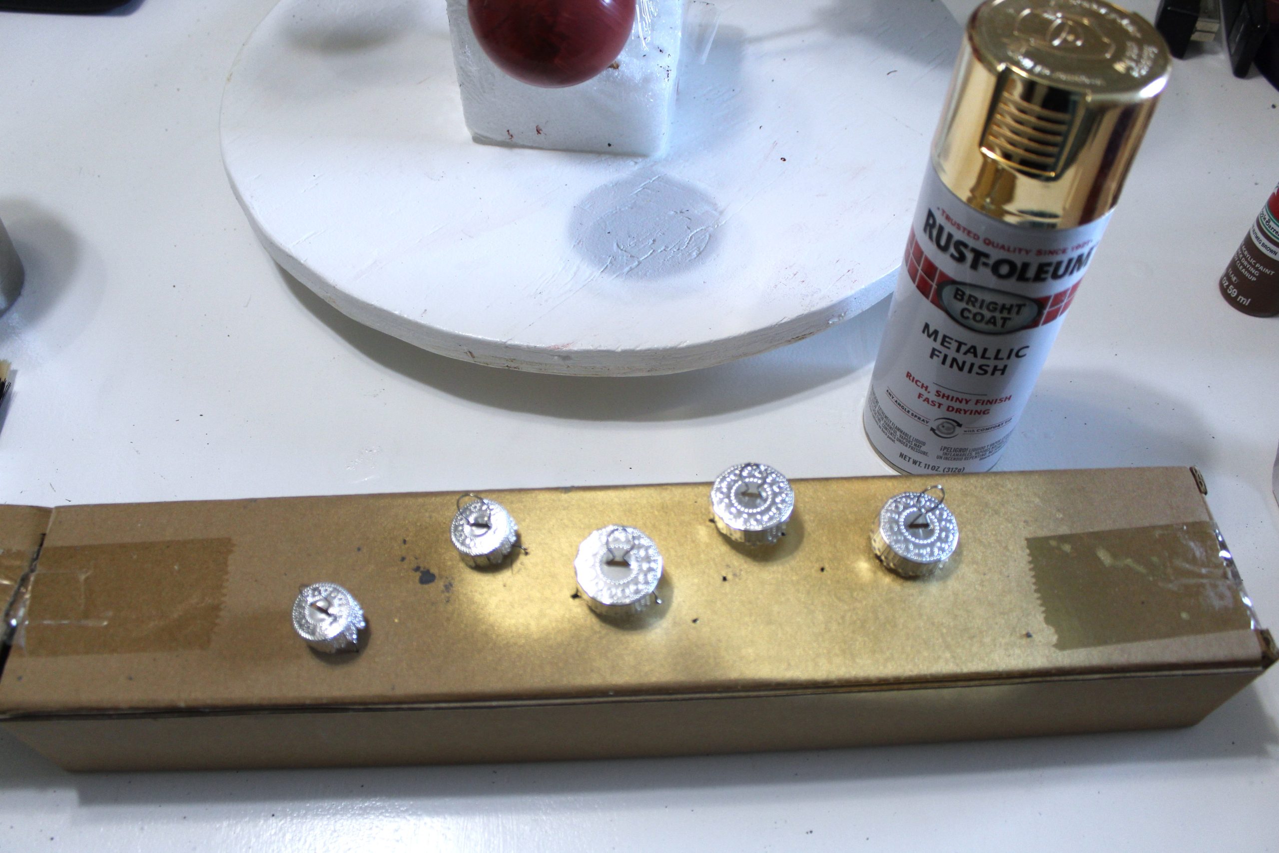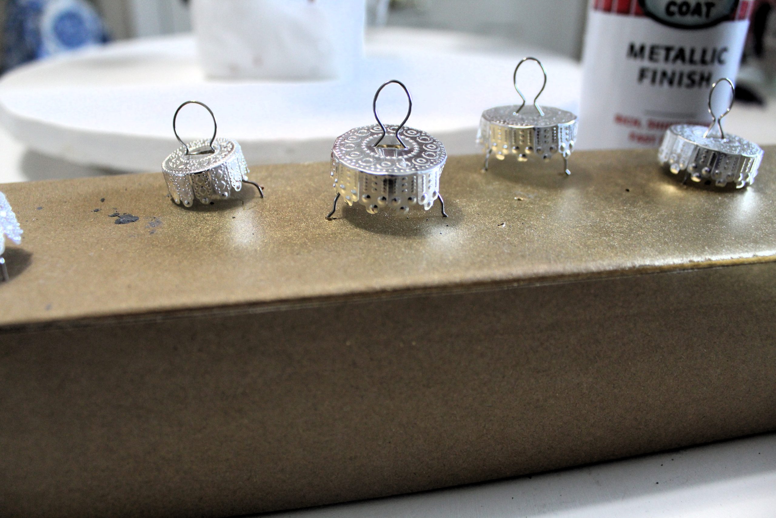 Let’s get to making some pretty vintage ornaments.  First, we need to remove the caps off the ornaments, we will be spray painting them with Rust-oleum Metallic Gold Spray Paint.