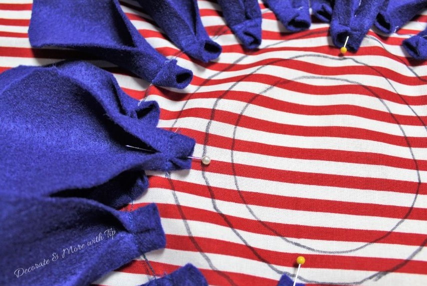 To attach you pedals to the front cover.  I started with 4 petals at 12, 3, 6 and 9 o’clock.  I pinned them to the outer circle with the stitch on the line.  Stitch the petals on.  Or you can glue them to the front pinning until the glue dries.