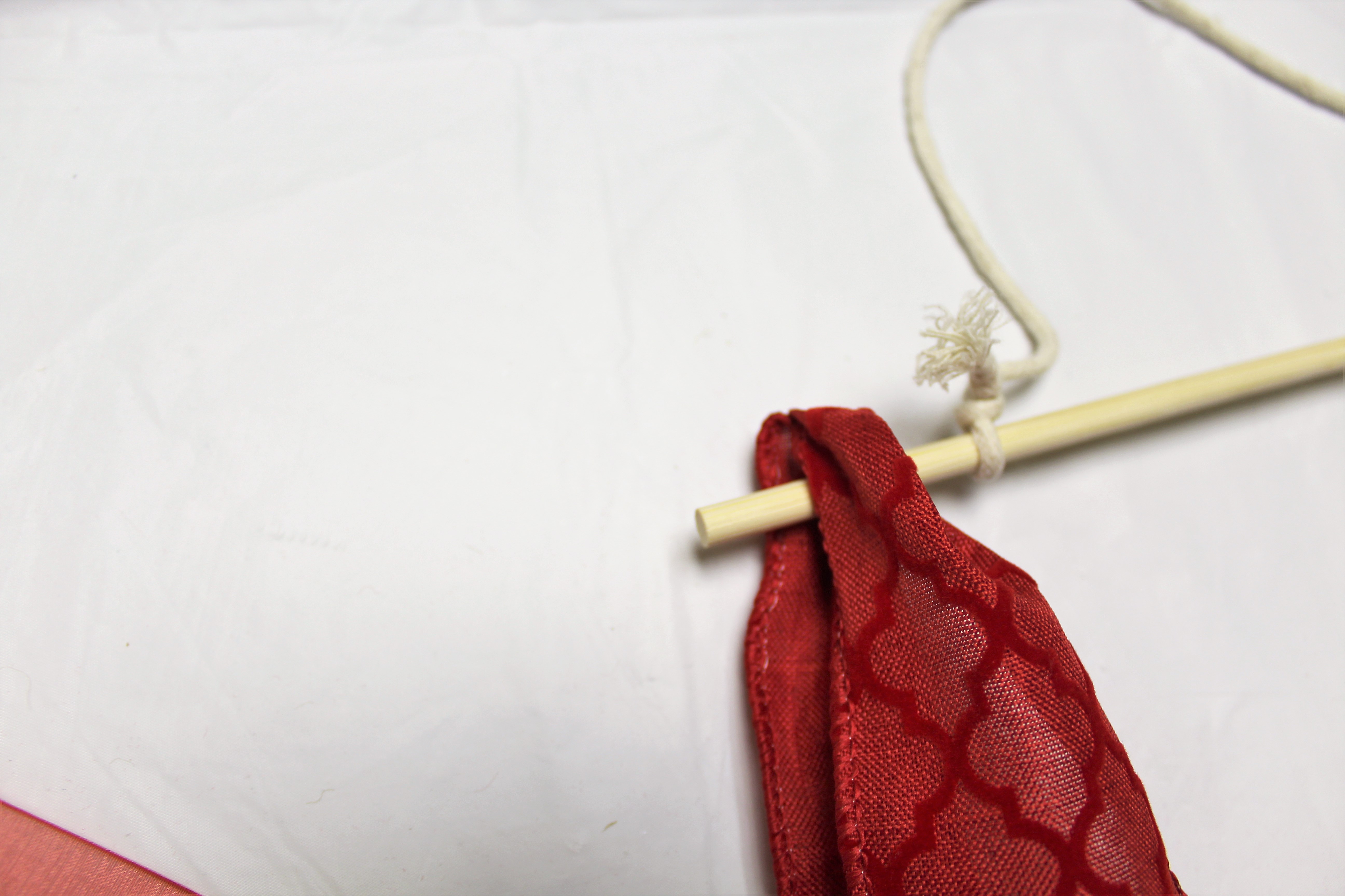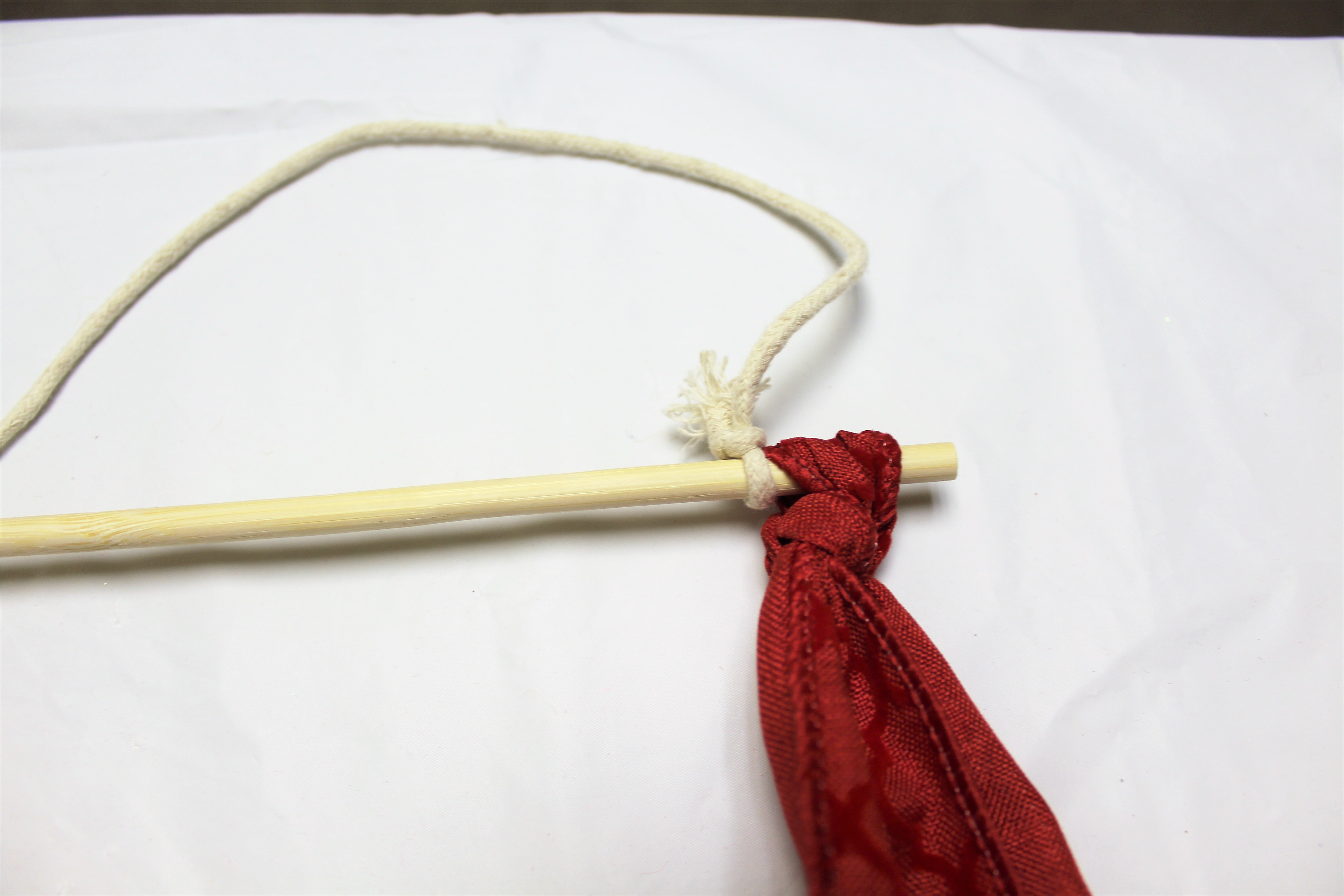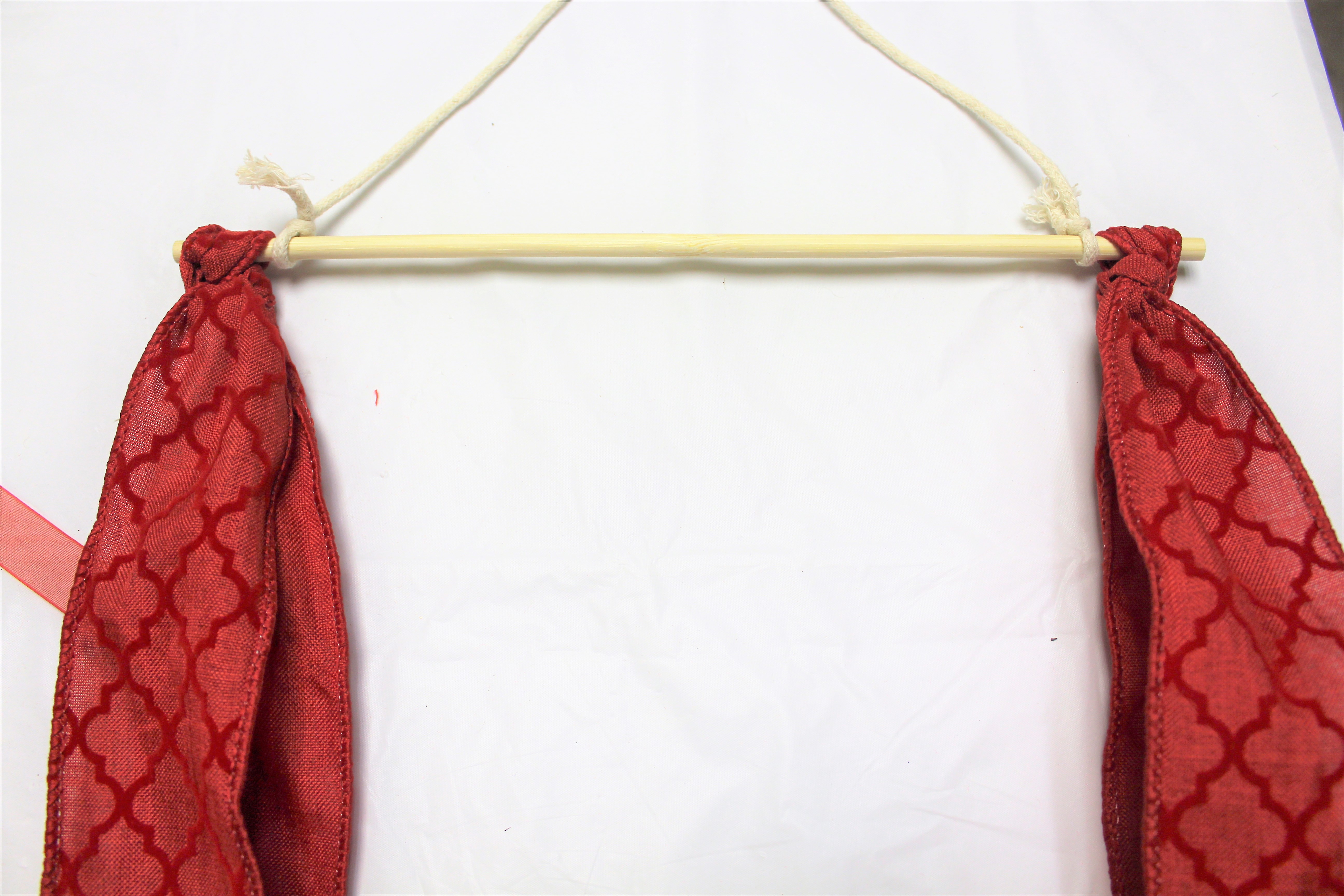 Applying the ribbon to your rod. Fold your ribbon in half and place the center of the ribbon over the dowel rod. Tie the ribbon in a knot around the rod.
