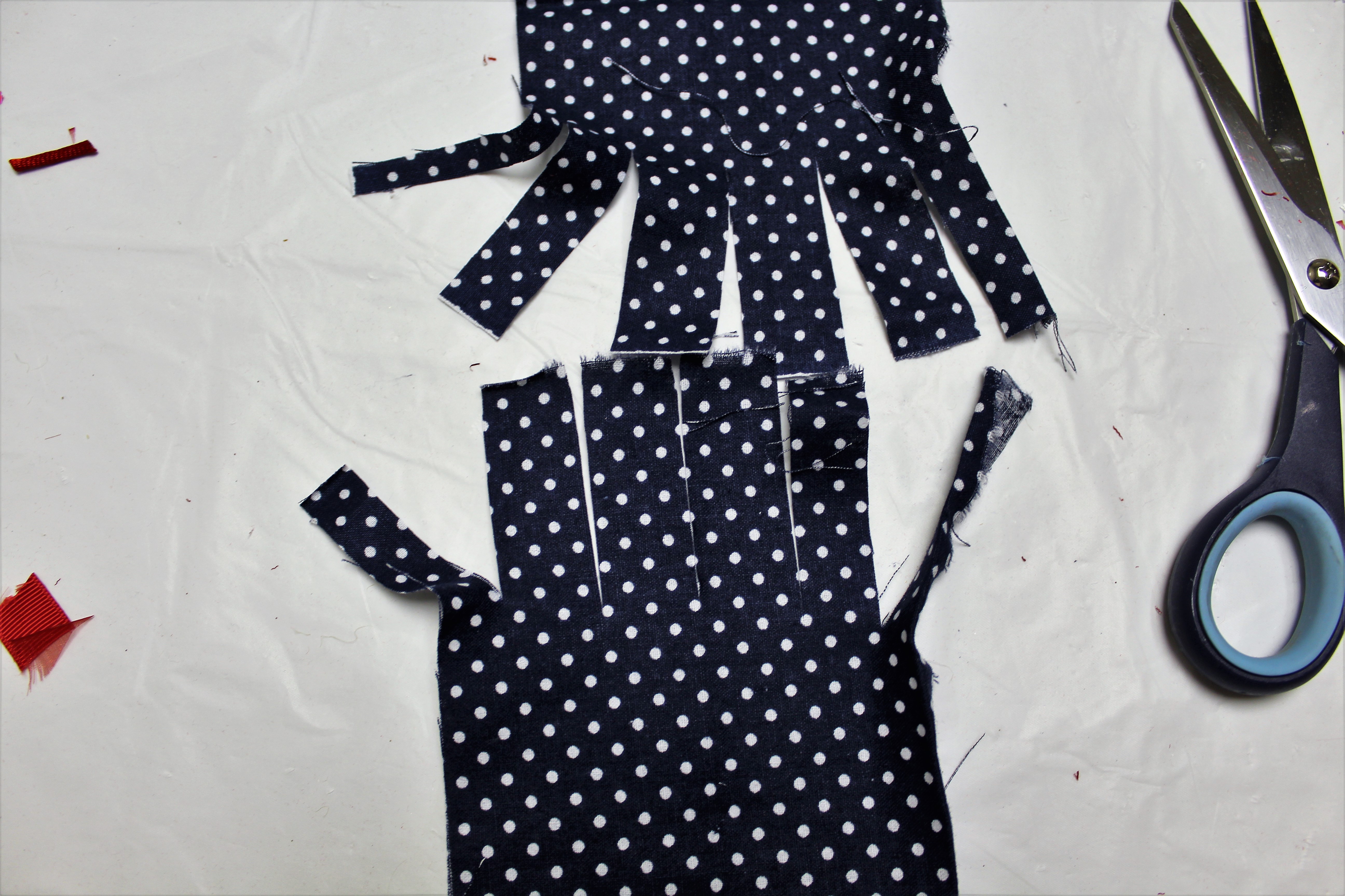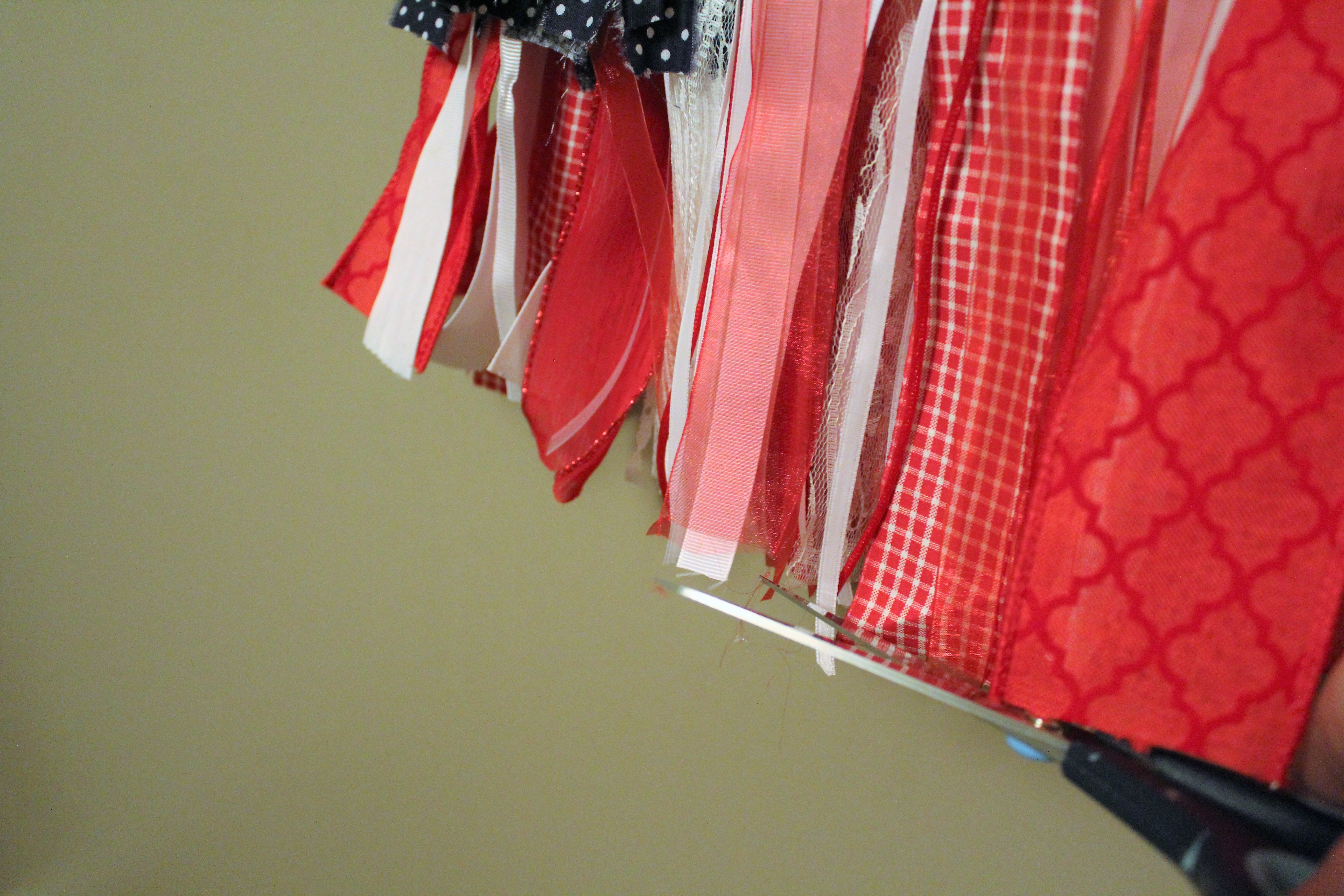 For the material, I cut 1 inch slits for the navy and 2 inch slits for the red on one edge and ripped into strips.