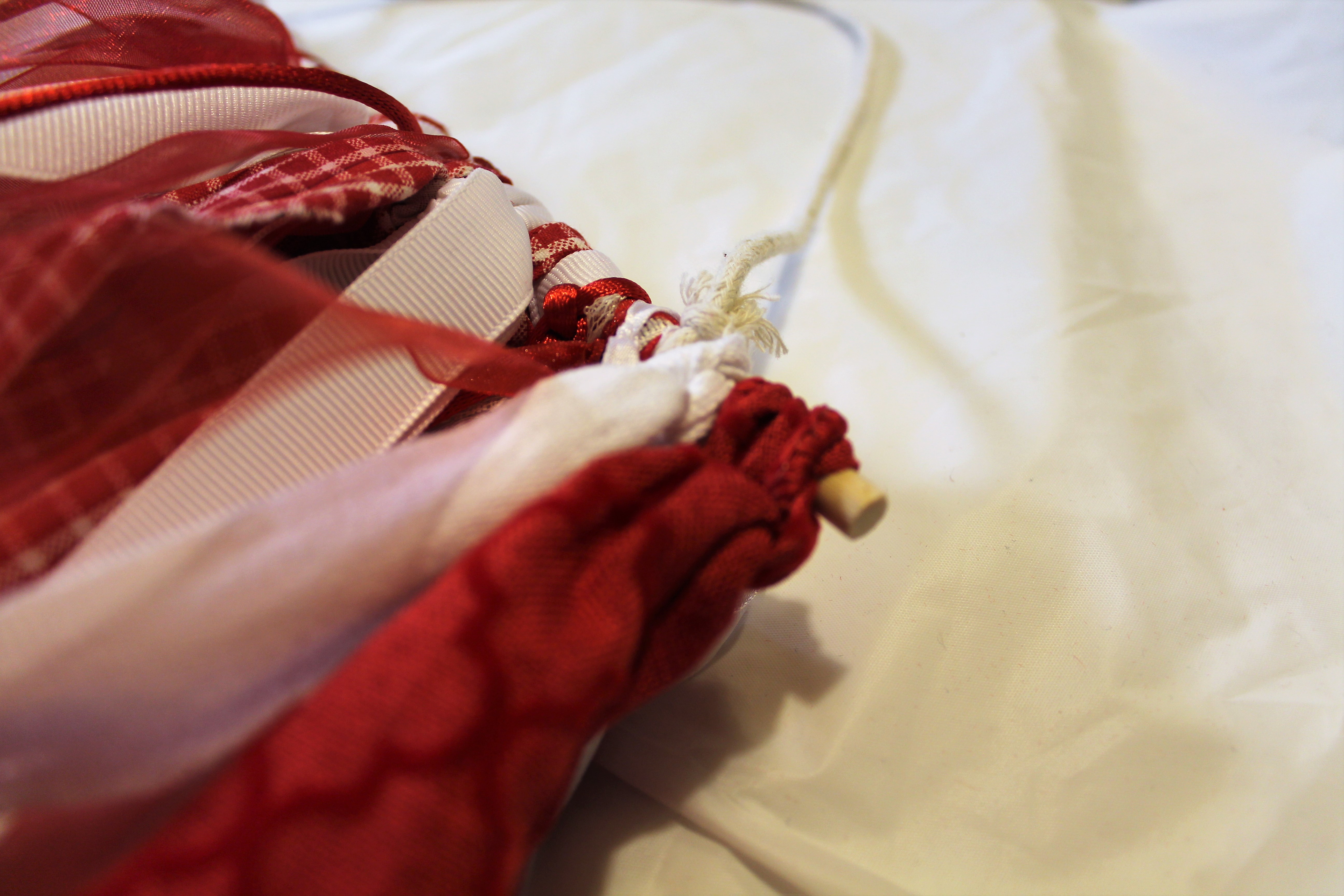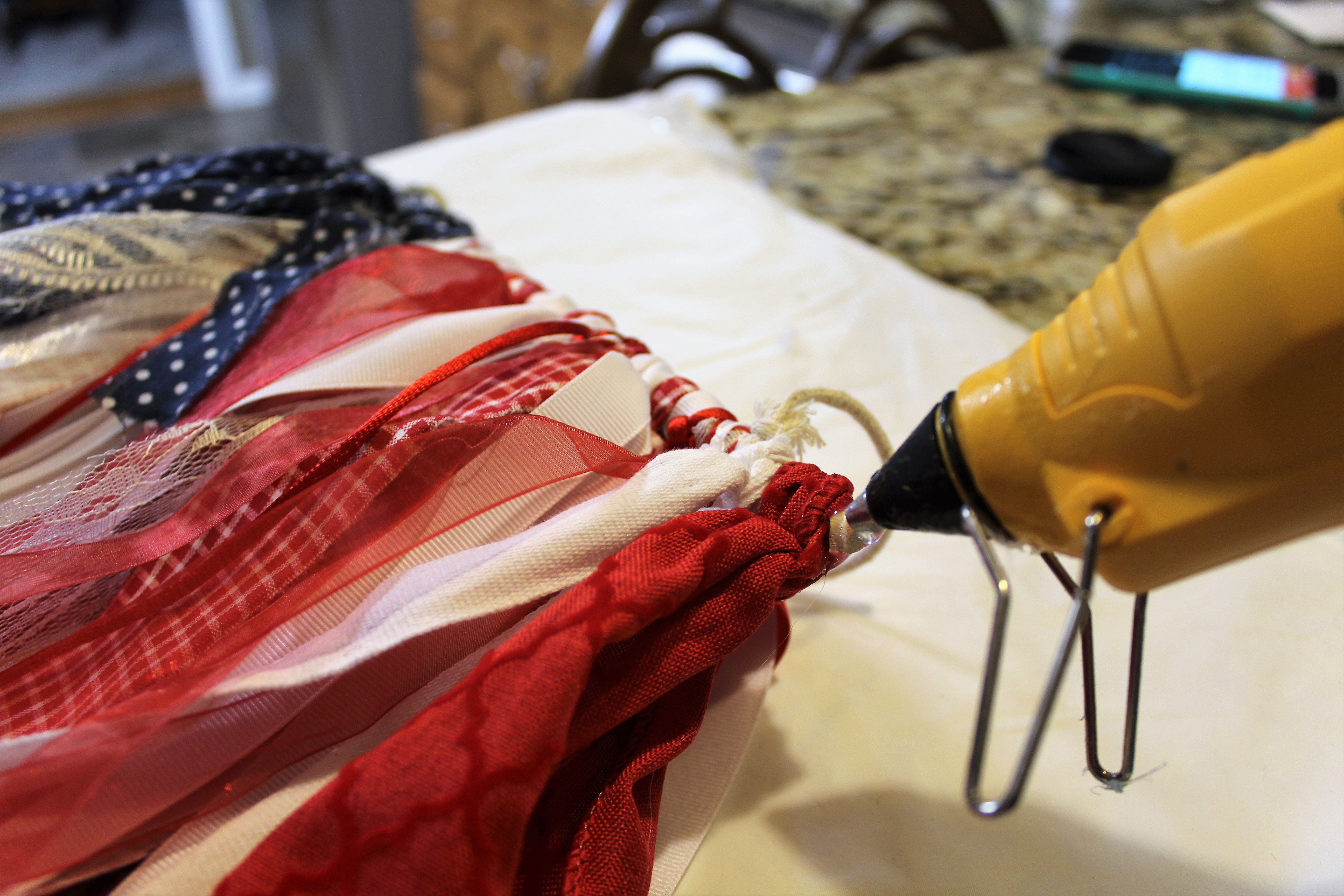 Take the navy material and add it to the left side tying it in a knot over the red and white ribbon. Trim it all even with each other half the size of the red and white ribbon