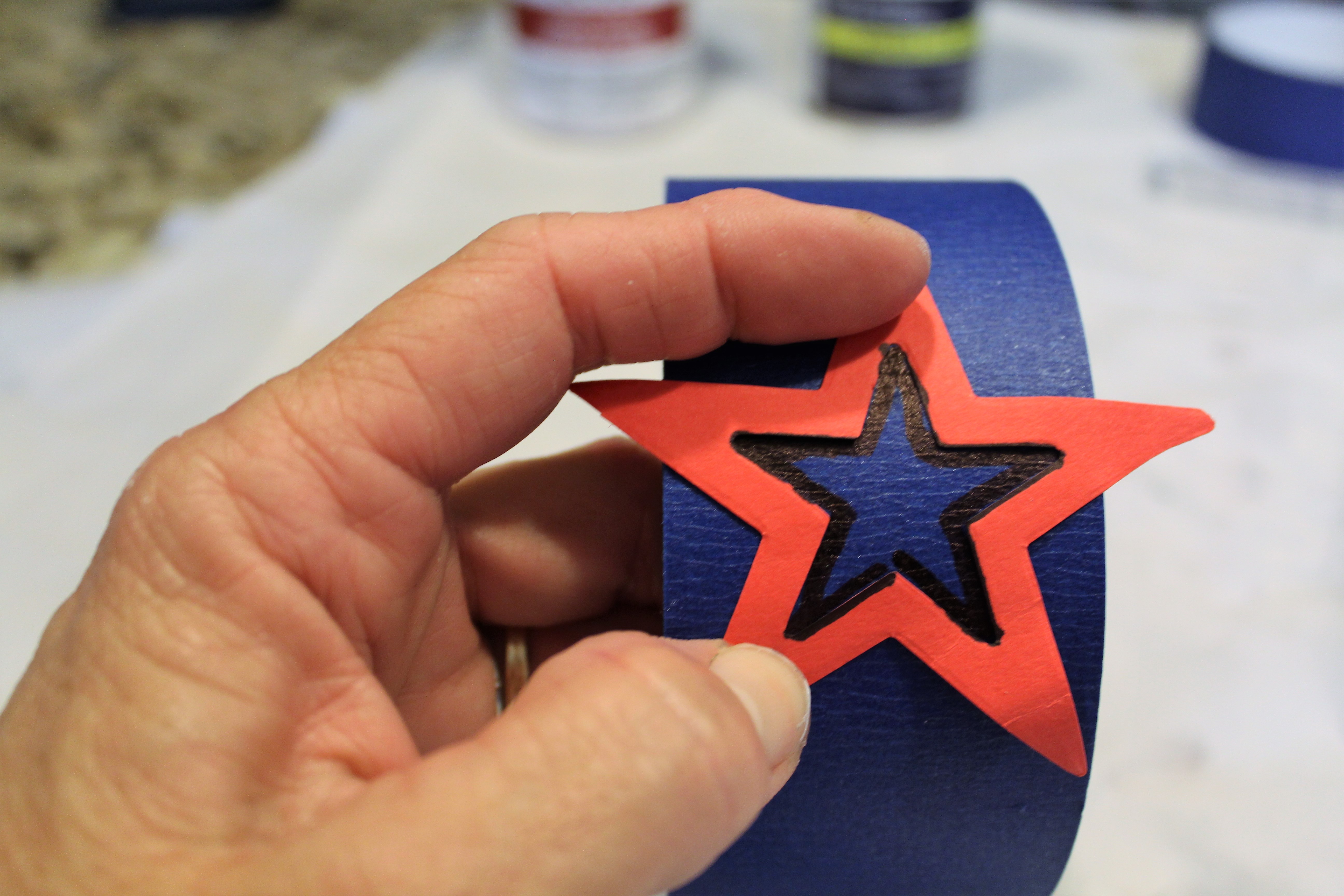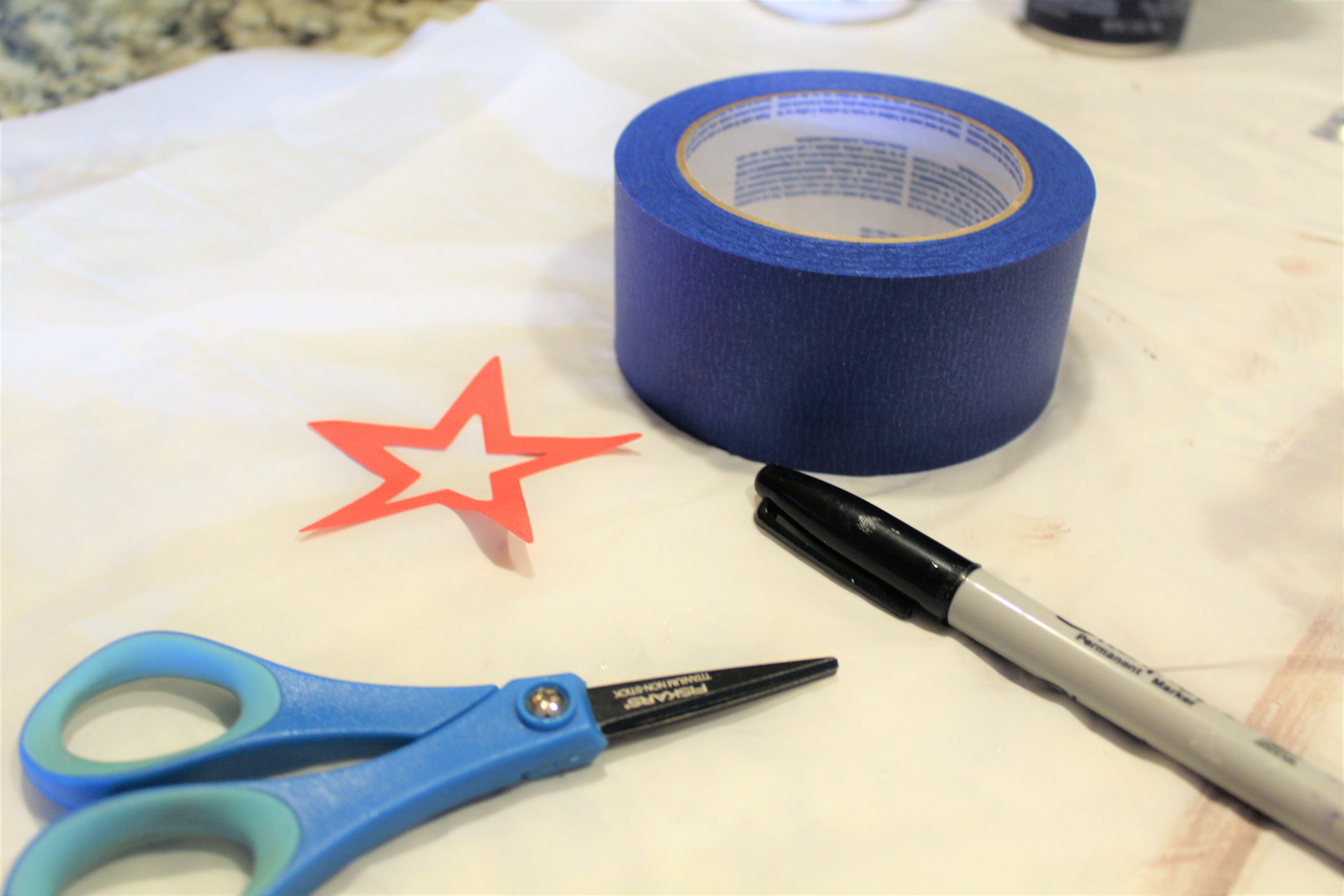 While letting the white spray paint dry I am going to make 8 stars. I used the painters tape and traced the stars onto the tape.