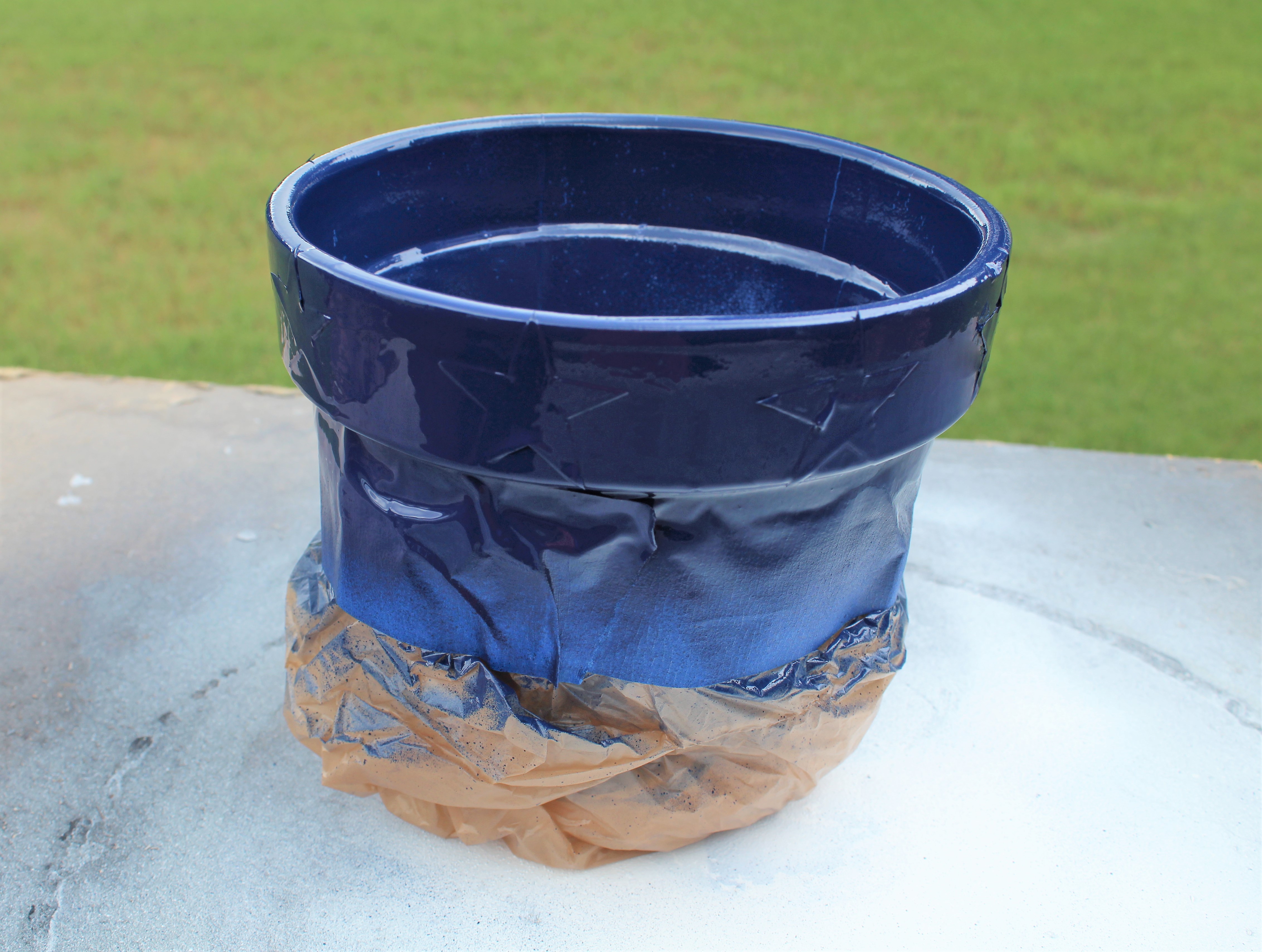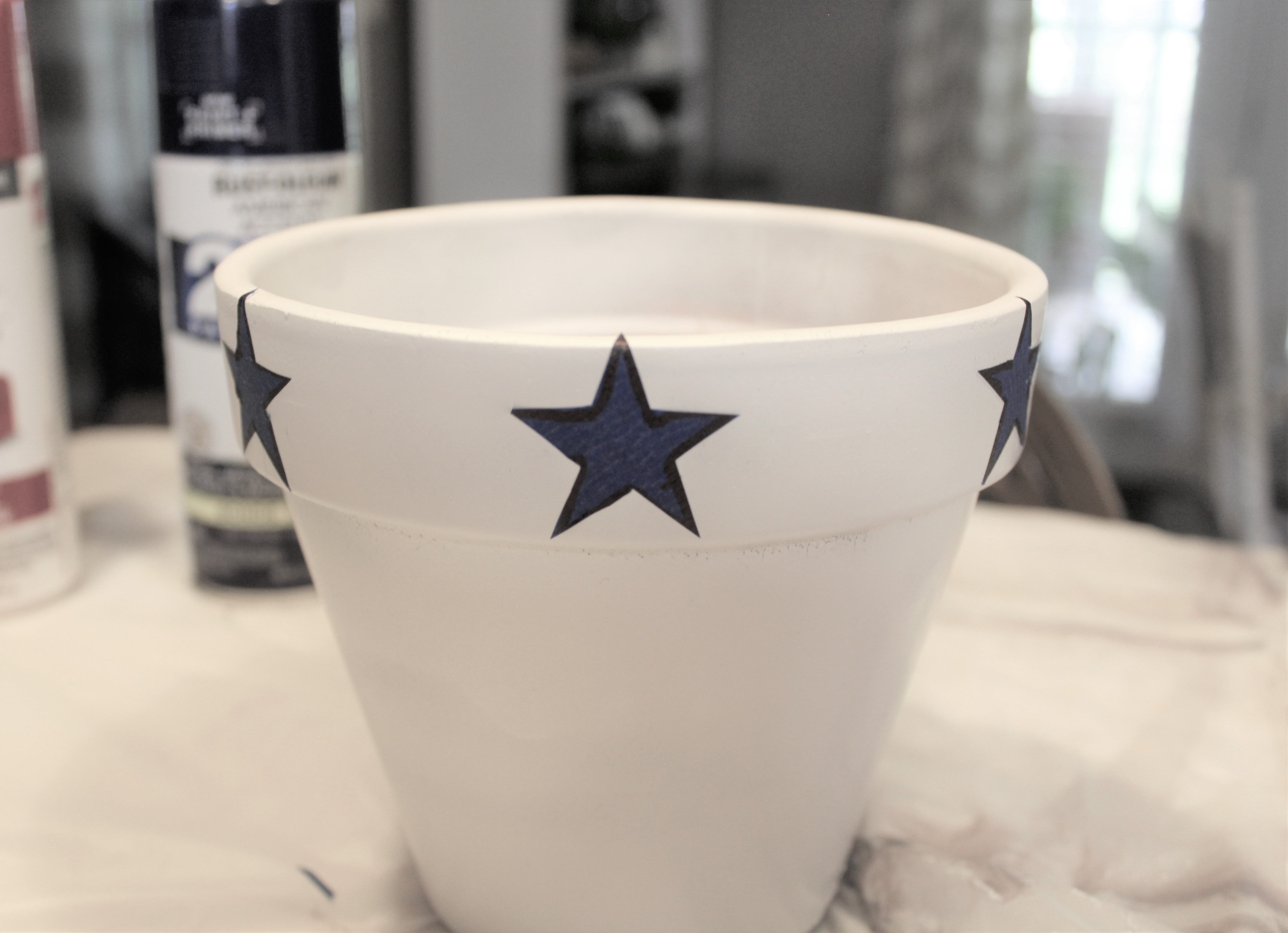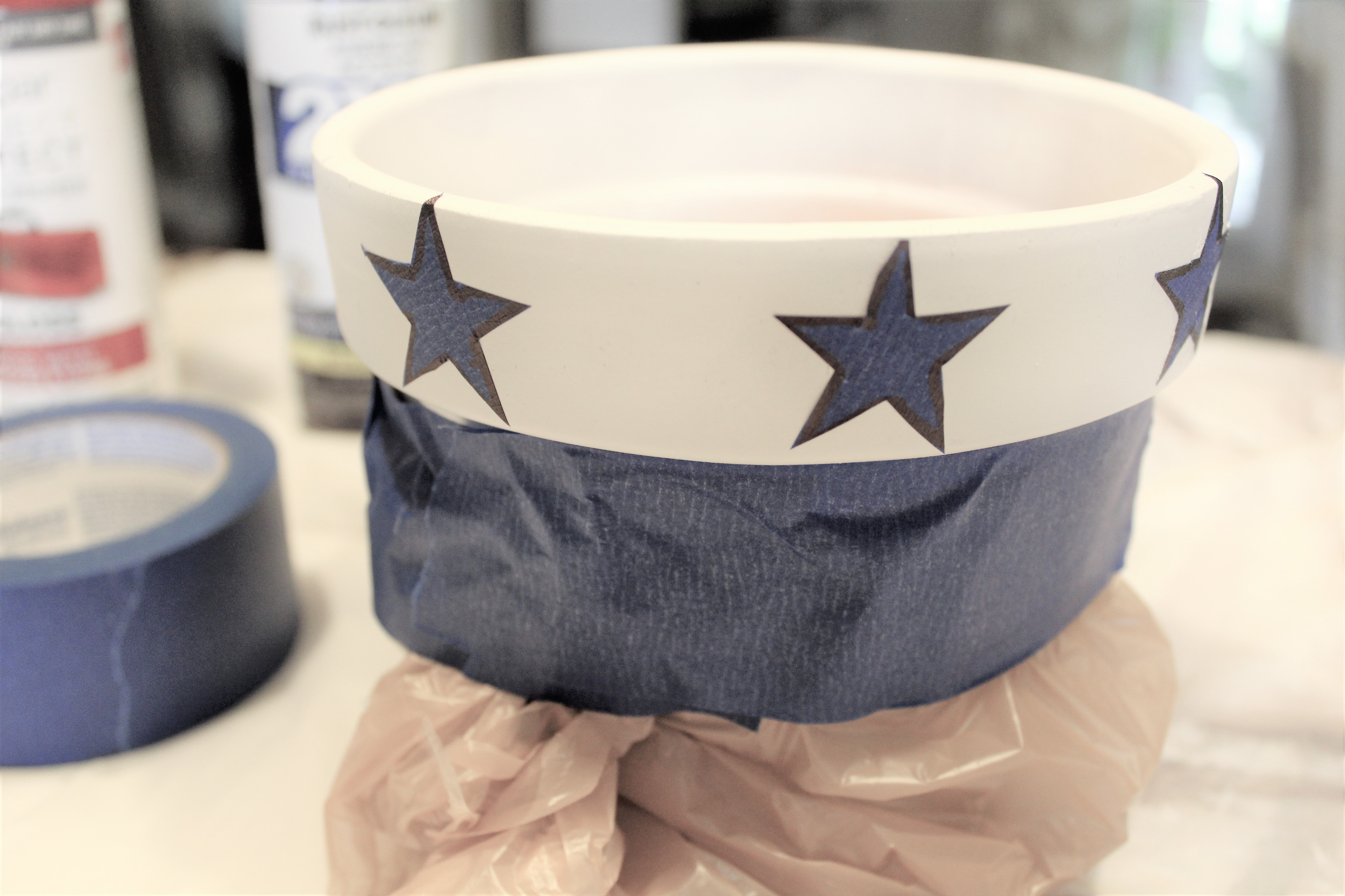 Cut the stars out and spaced them evenly on the top rim of the white clay pot. Taped up the bottom with a plastic bag and painters tape to protect the rest from getting spray painted.