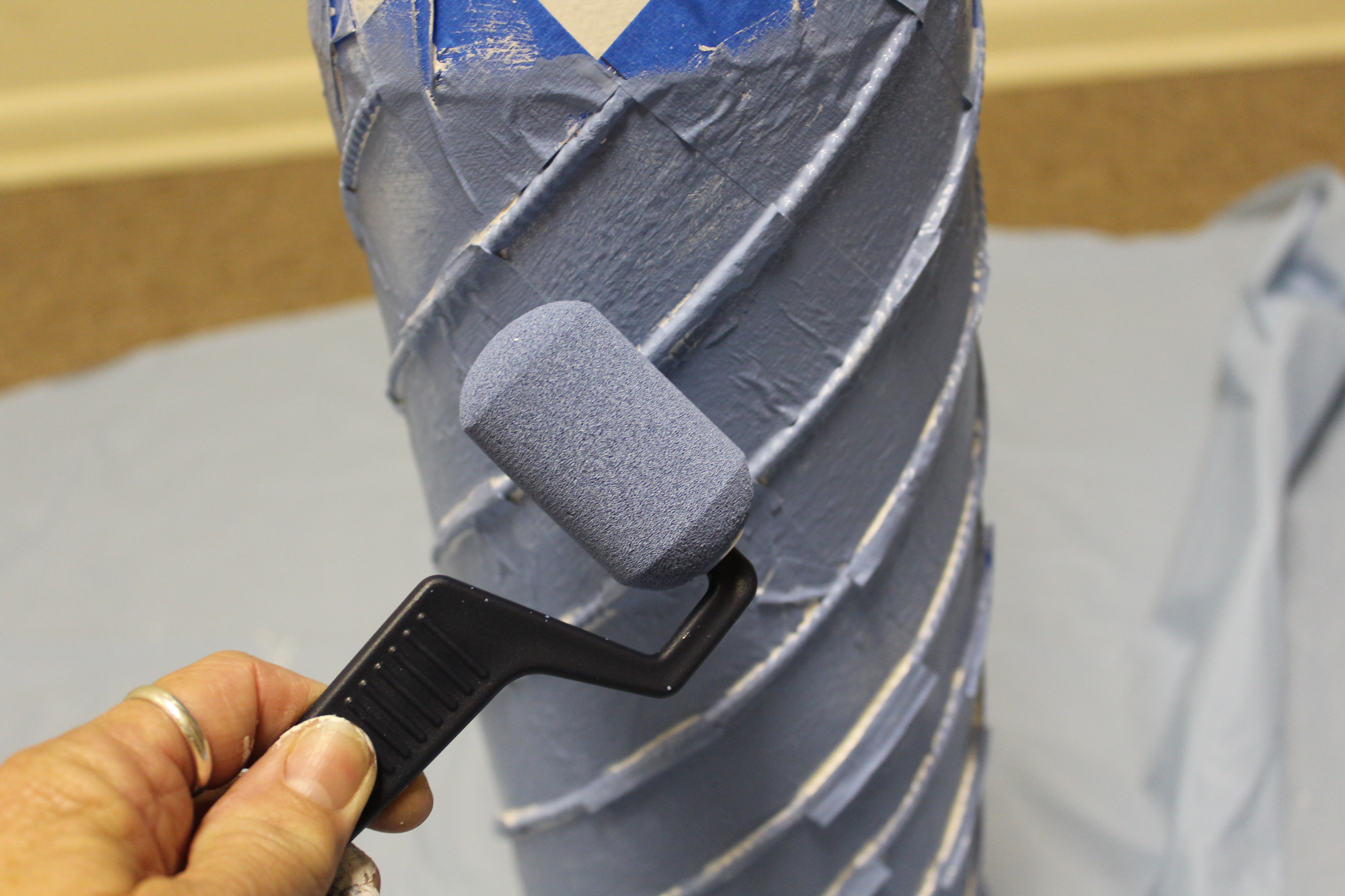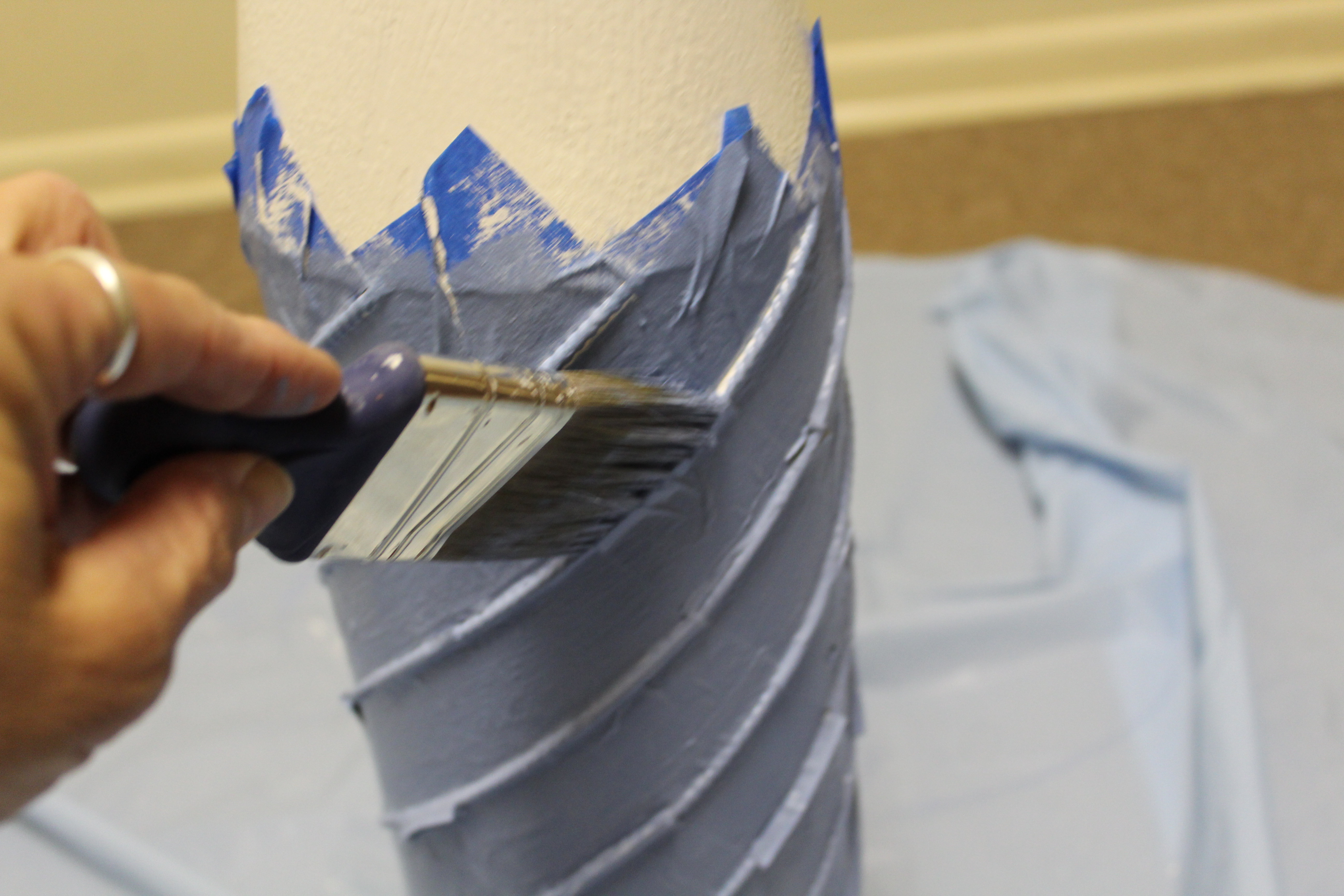 As you know when I use painters tape for a design purpose I like to give it a light coat of the base color to help with paint bleed.  I gave it one coat of the white paint.