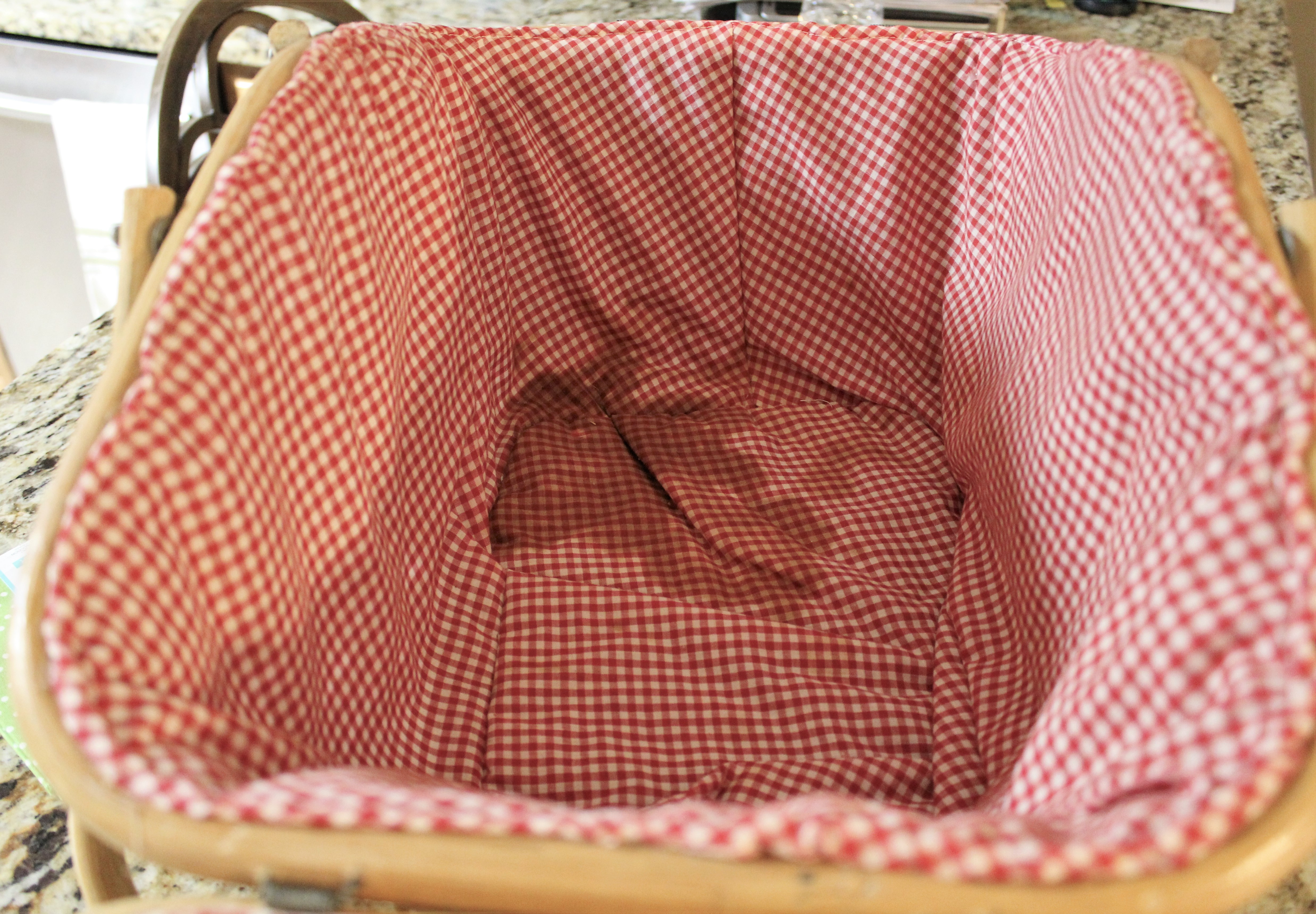 It is a sturdy basket but the lining is stained and it has no place to store any utensils. I thought what a better time to give this basket a makeover than now.