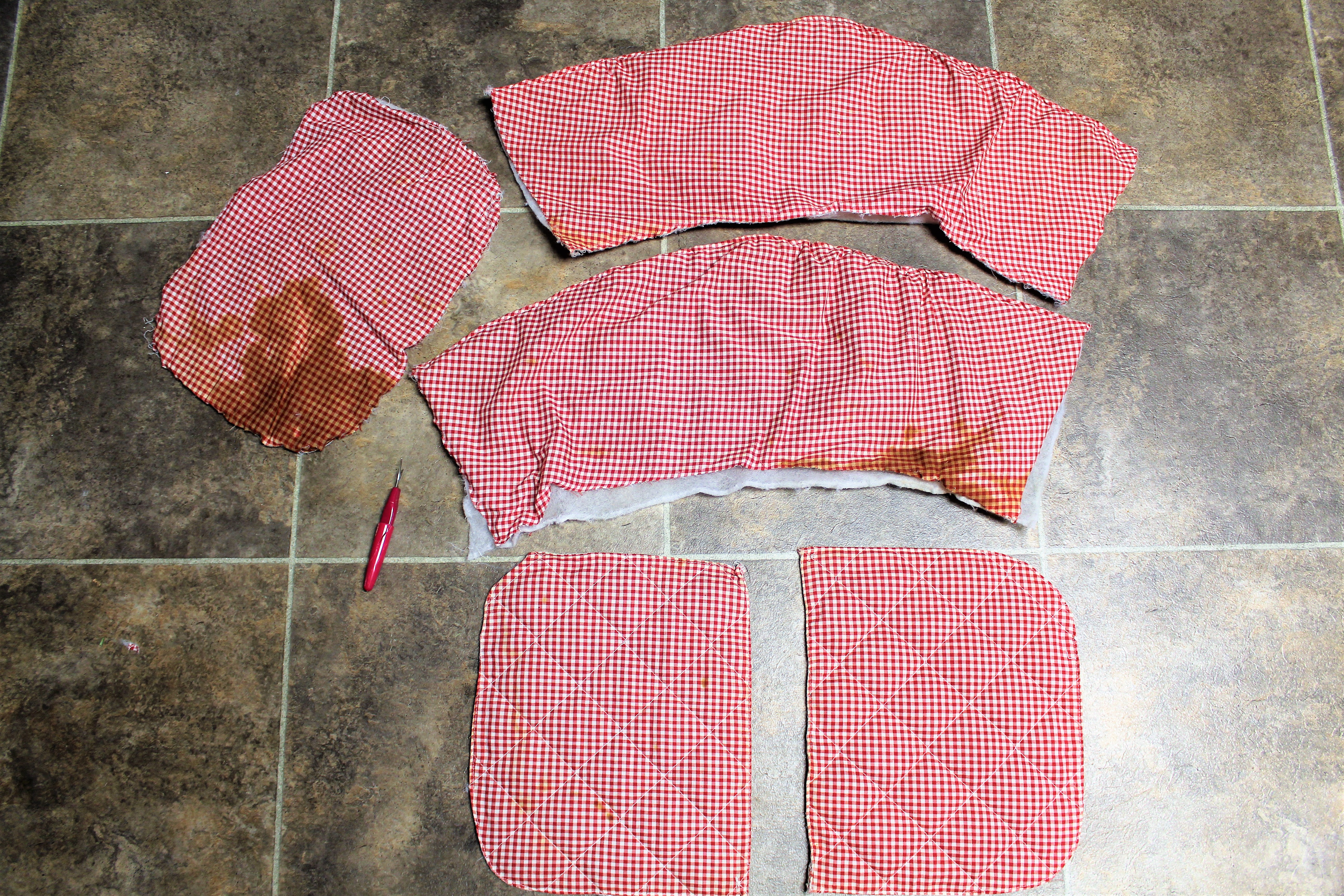 I purchased a yard of outdoor fabric from Walmart under $4.00. Using outdoor fabric would be the best since I can wipe it down when it gets soiled.