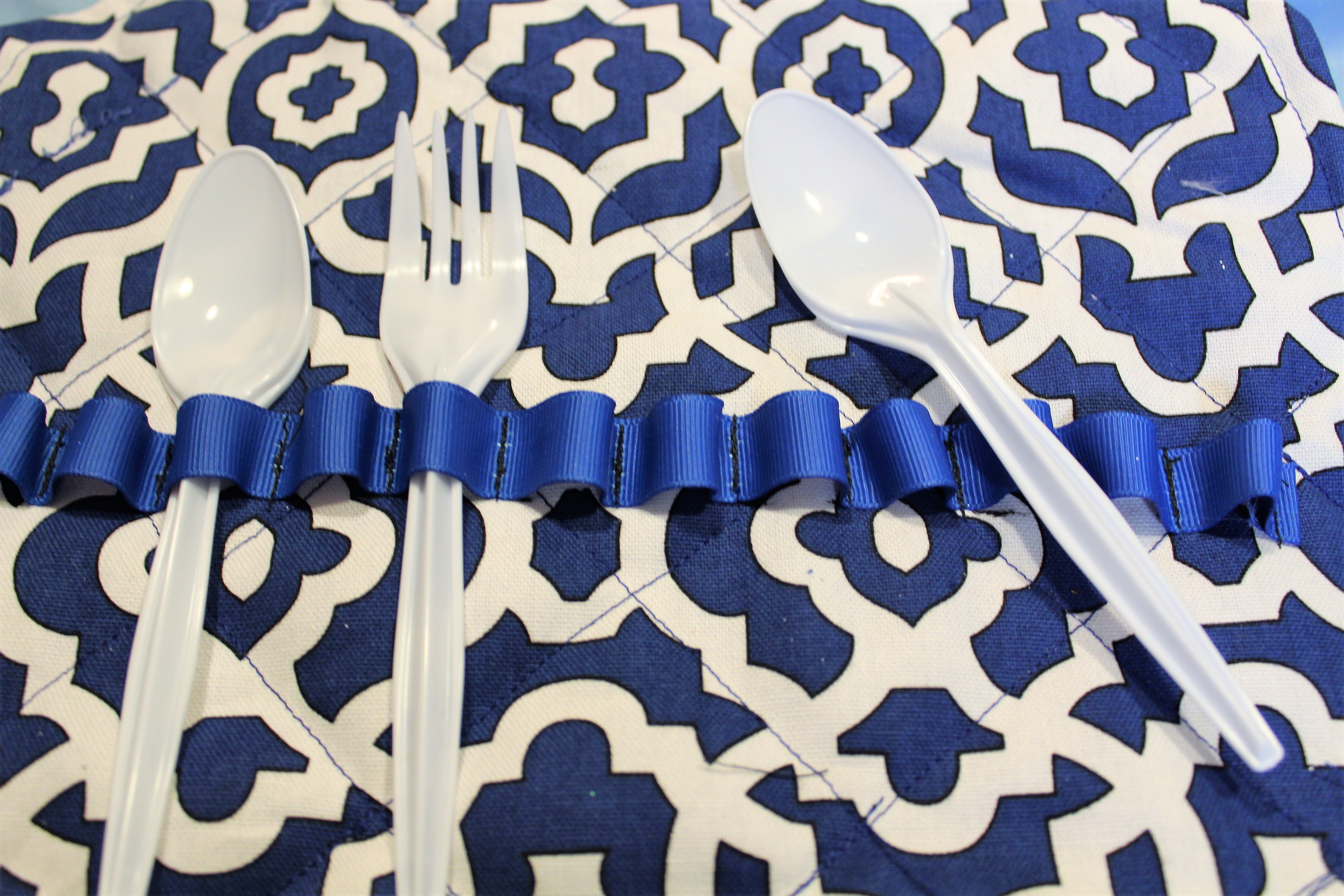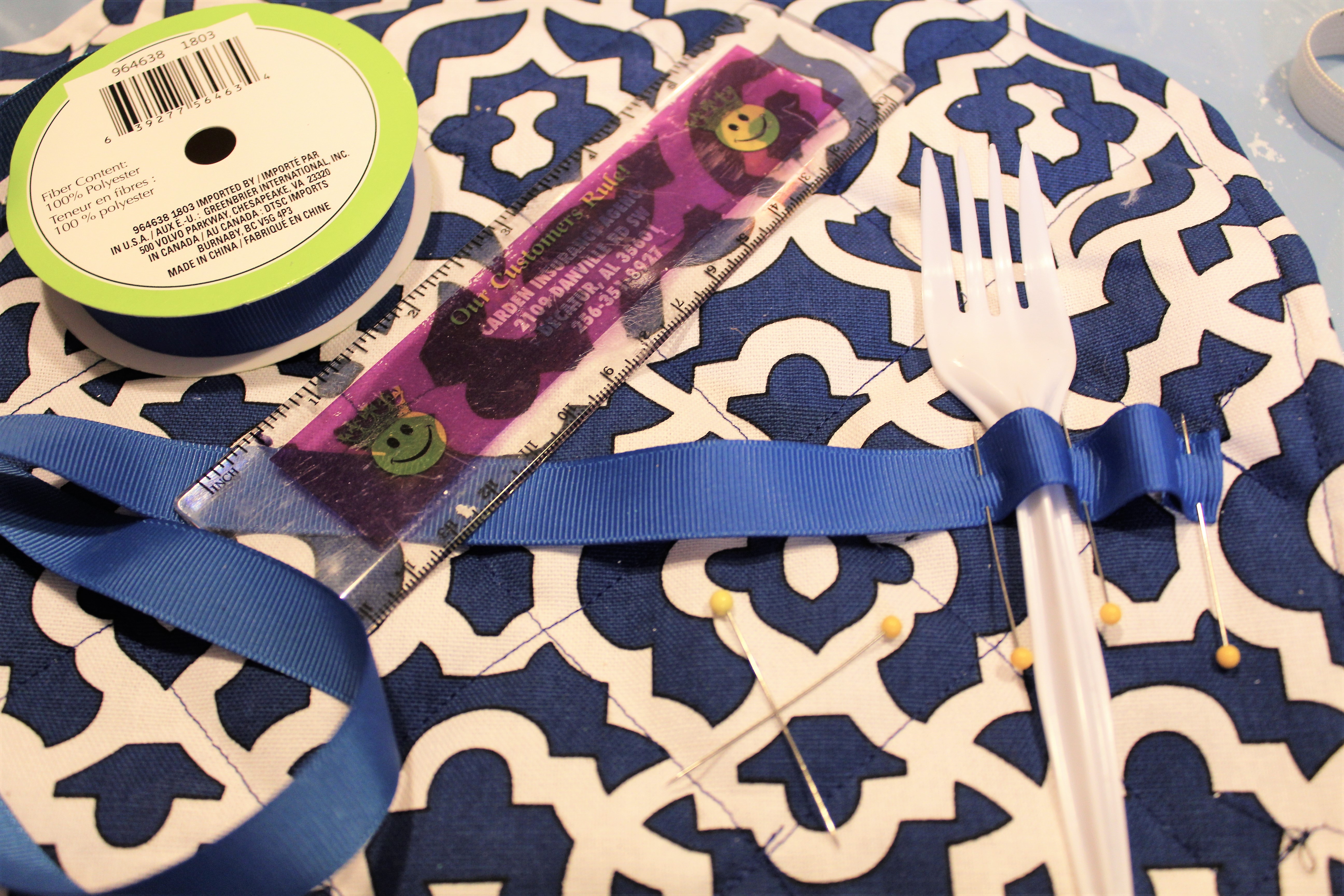 Before I placed the two top parts back on my basket I wanted to make something to hold utensils and plates. I purchase a spool of Dollar Tree blue ribbon to make holders for both. With one topper liner I took the ribbon and a plastic fork, measured, pinned and stitched little loops in the ribbon.