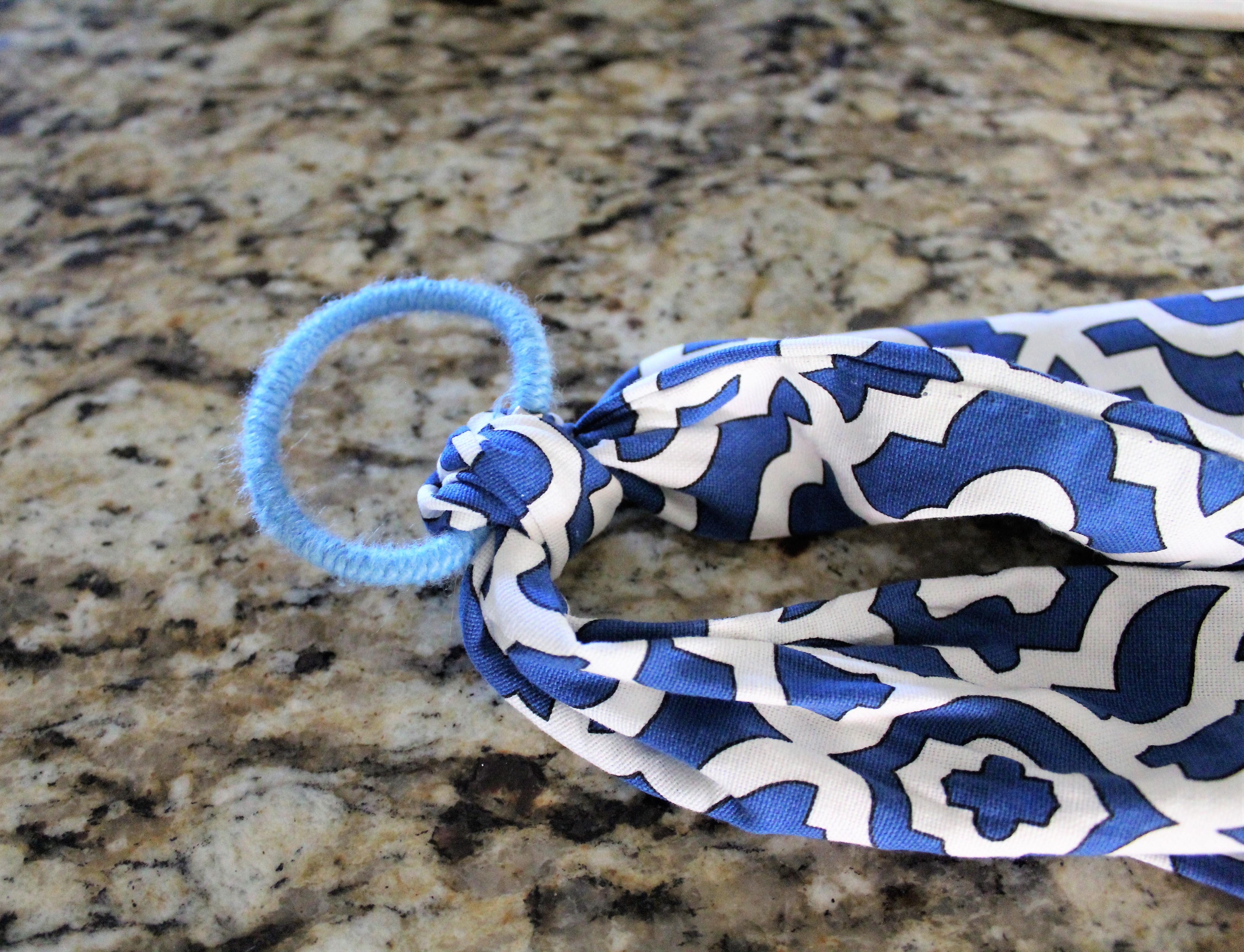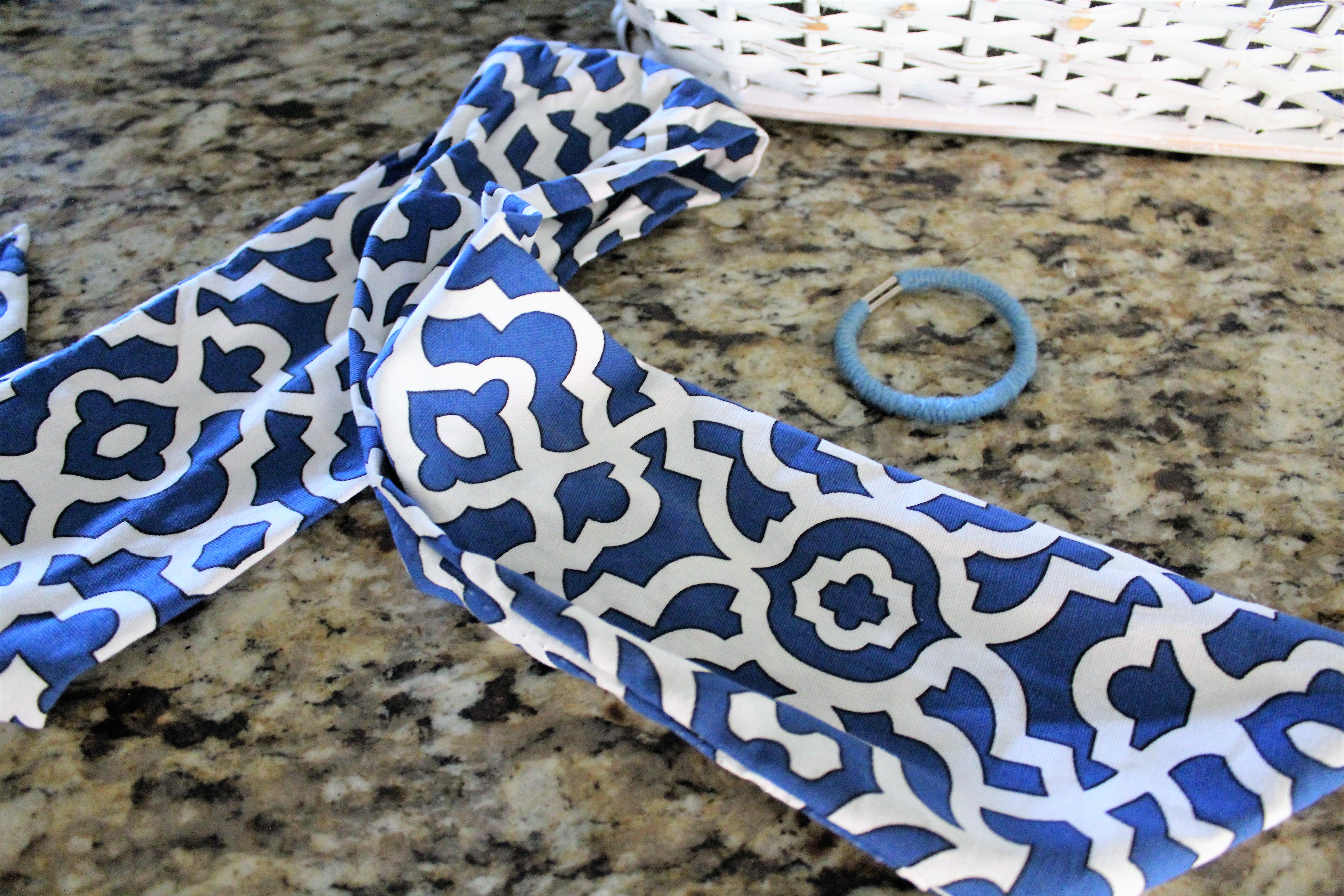 Now for the closure. I looked at the top to see what I could attach to keep the lids closed, but to hot glue something to the basket wouldn’t hold very long. I decided to grab one of my pony tail holder (it’s a new one 🙂 ). I also took the extra fabric and stitched up a little scarf. I tied the scarf to the holder. There you have it. A closure that works and looks pretty darn cute, if I say so myself.