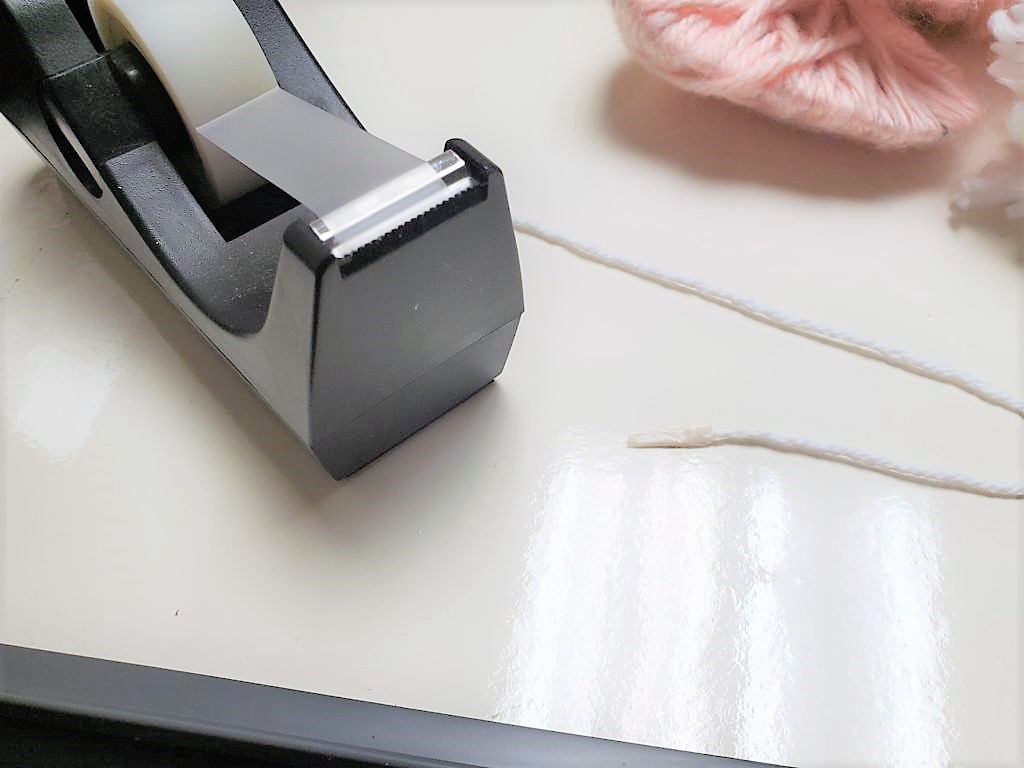 Placing tape around the end of the yarn helps thread the yarn through the bead.
