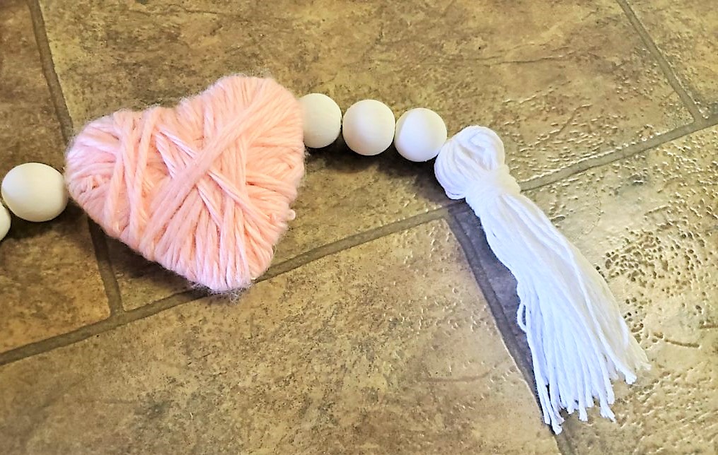 I am going to be using my hearts and pompoms from my garland, white yarn, white paint and some of those extra wooden beads left over from our daughter’s light fixture.  I have made several things out of those beads. 🙂