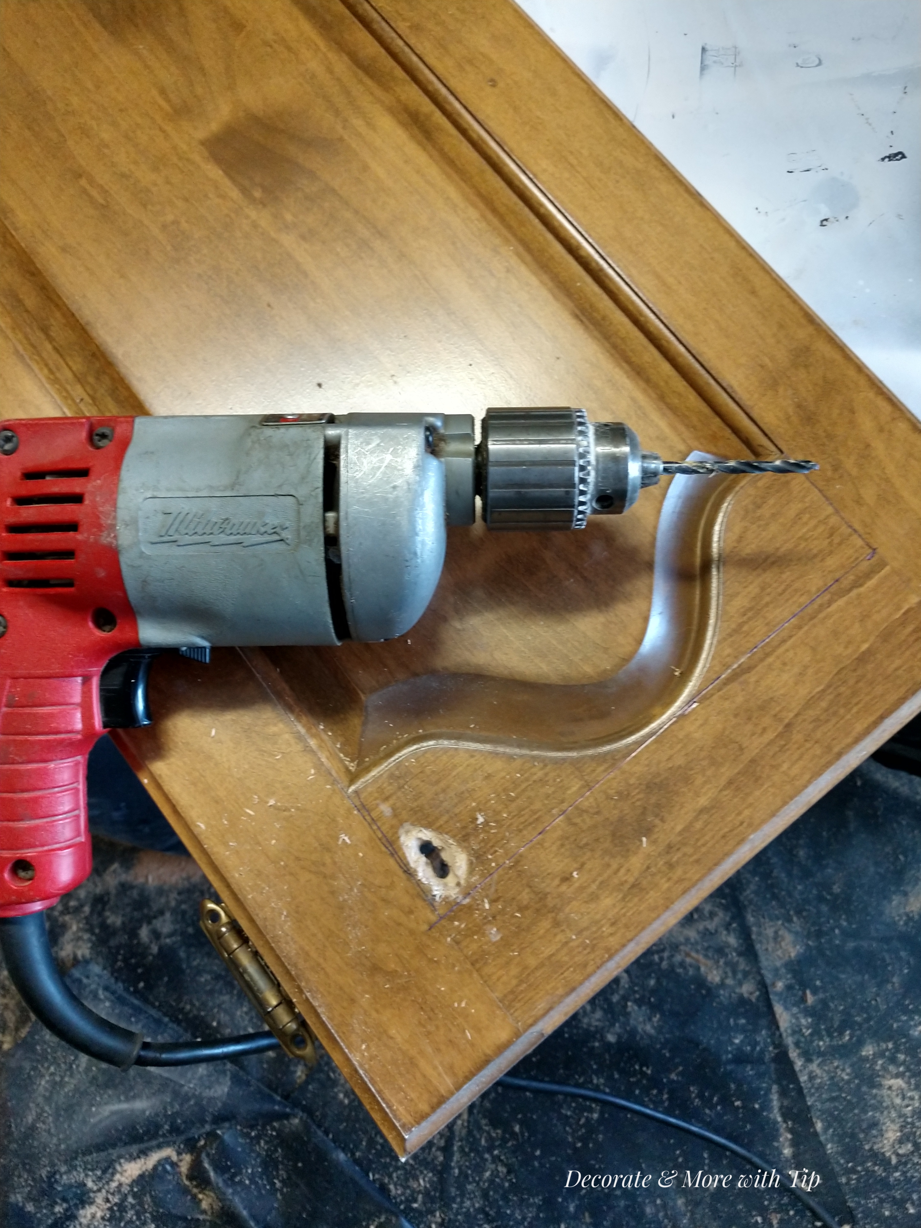 The Thrift Store cabinet doors are cathedral style doors and the bottom cabinet are square trim doors. Houston we have a problem. 🙂 Not really, I took my power saw and cut the panels out of the cabinets. (Yes…everyone, I did this project all by my lonesome). Just that simple. Here is how I did it. As you can see it’s not perfect, but it turned out the best it could for this girl.
